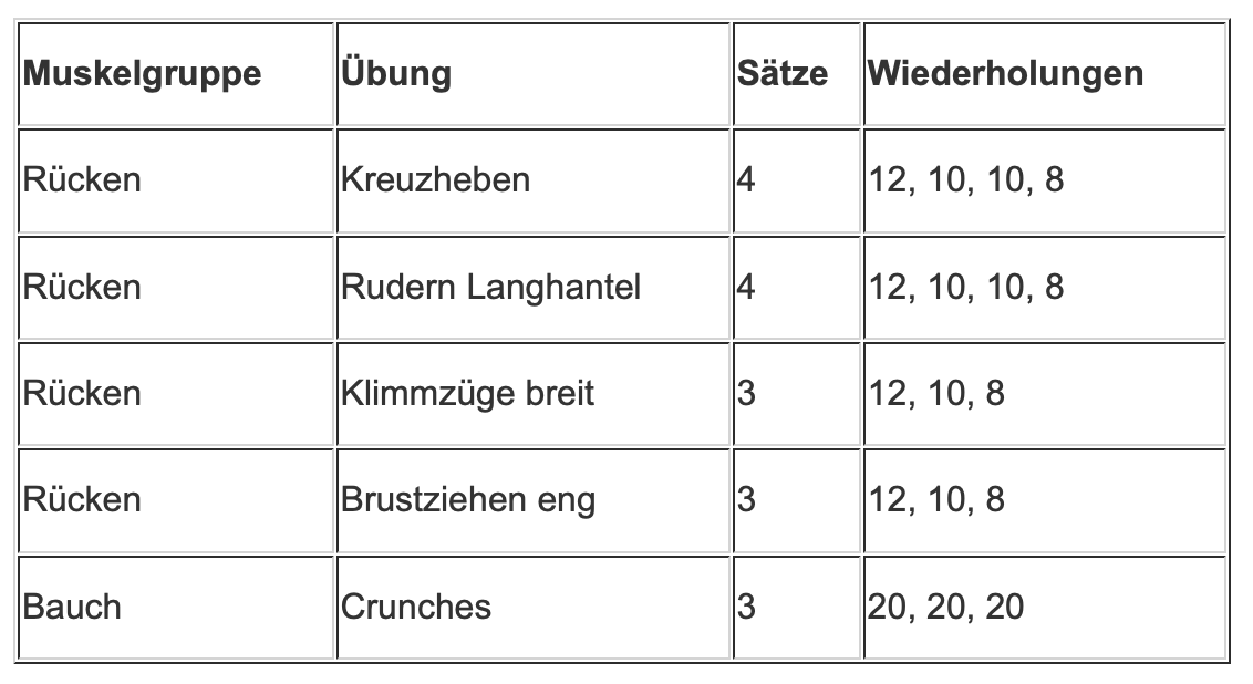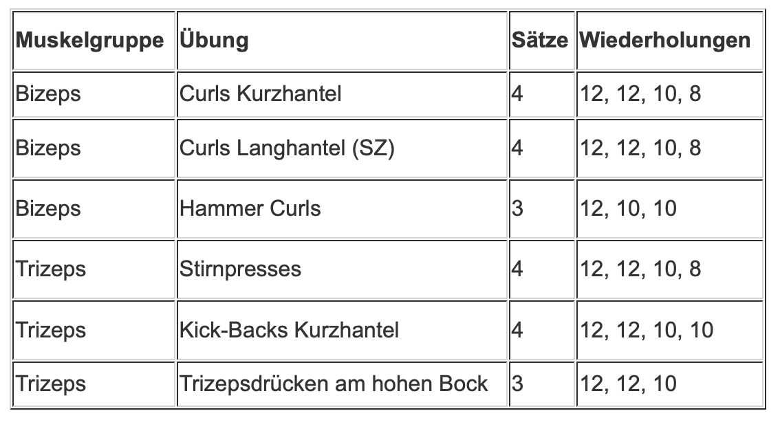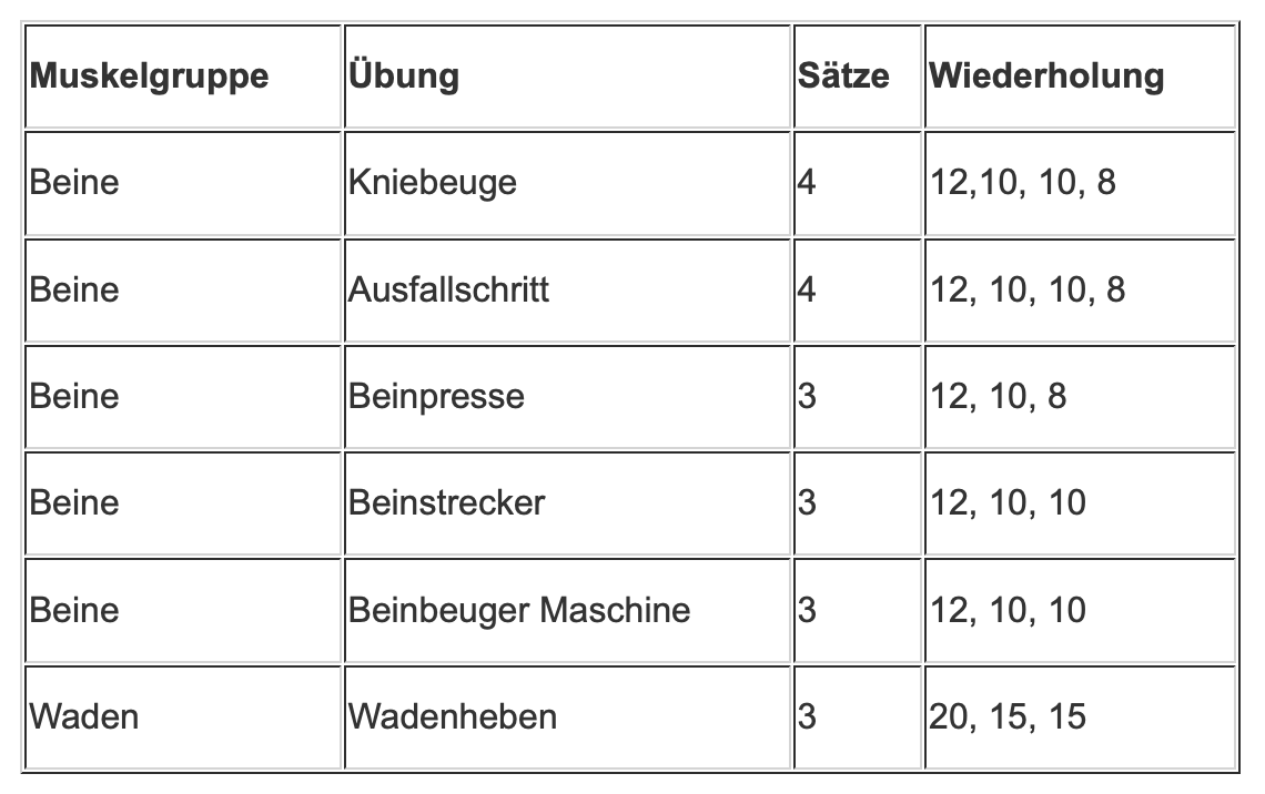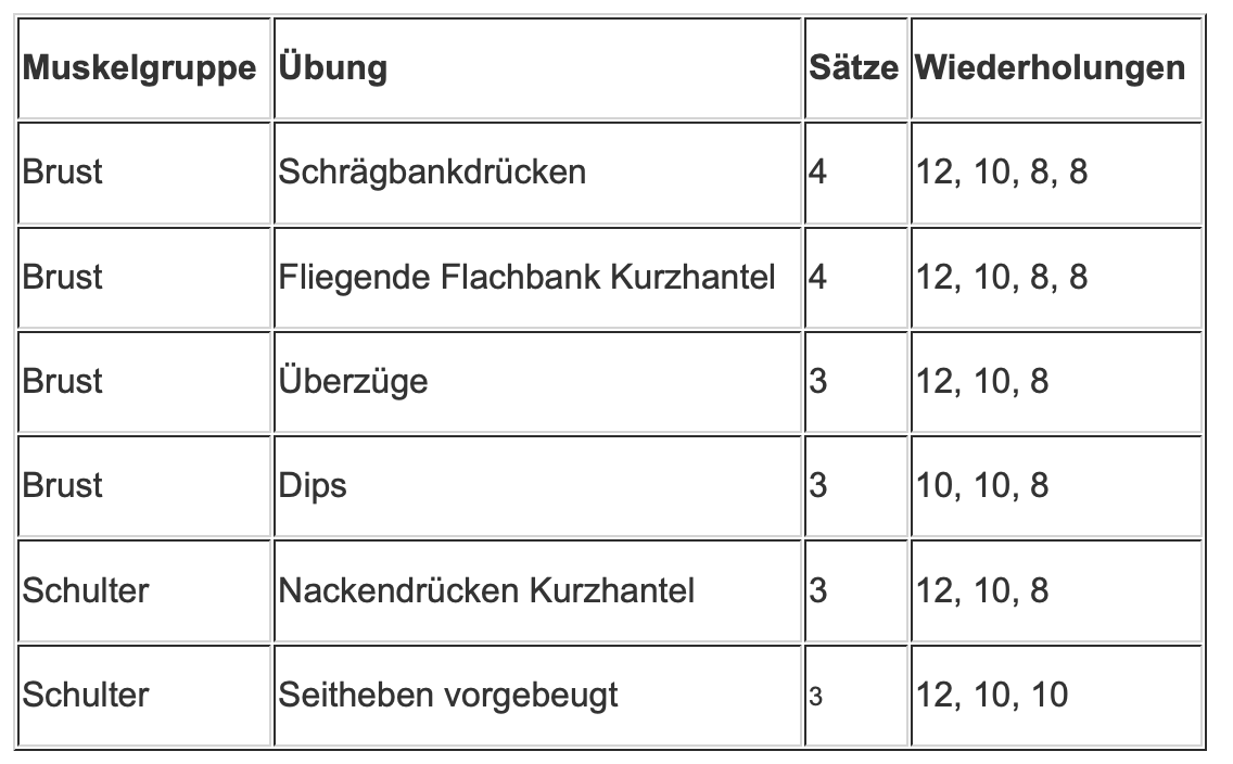 Das 4er Splitt Training empfiehlt sich für Fortgeschrittene besonders wenn genügend Zeit für ein Aufspalten in kleinere aber intensivere Trainingseinheiten zur Verfügung steht. Je weniger Muskelgruppen pro Trainingstag trainiert werden, desto härter können einzelne Muskelgruppen trainiert werden und um so größer fällt der dadurch resultieredne Muskelreiz aus. Anders als beim Trainingsplan für Anfänger sind bei diesem Trainingsplan ganz bewusst verschiedene Grundübungen (Mehrgelenk Übungen) aufgenommen. Diese Übungen empfehlen sich jedoch nur wenn die Ausführung von einem Trainer begutachtet und für richtig ausgeführt bewertet wird. Eine Kontrolle der Ausführung ist wichtig da sich ansonsten bei diesen Übungen mit schwerem Gewicht die Verletzungsgefahr erhöhen könnte.